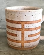 3.5 h x 3.5” w each mug is one of a kind and is hand thrown and individually designed. While each mug will have a similar look to the photos there will be variations to glaze and designs. Microwave and dishwasher safe.